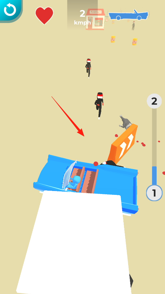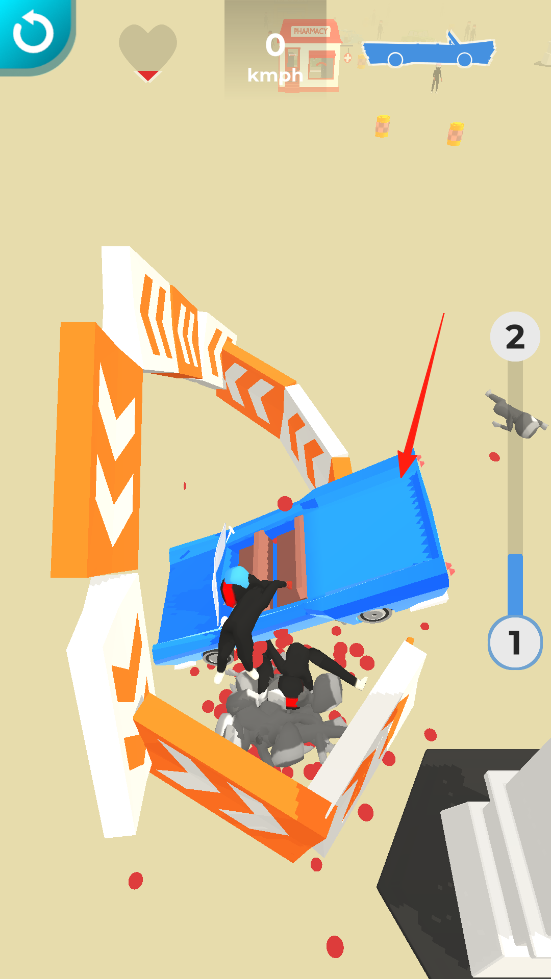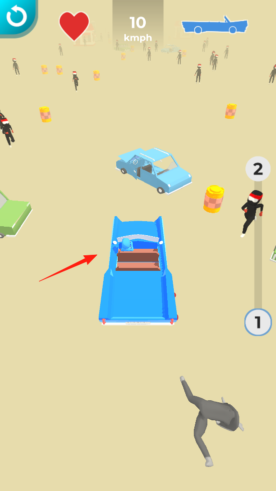 2、駕駛中加速(2kmph),沖向斜坡并騰空,借物理彈射機(jī)制,飛躍時(shí)撞擊路上敵人,感受空中撞擊的爽快感,利用地形和速度拓展戰(zhàn)斗玩法。