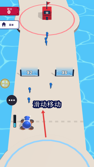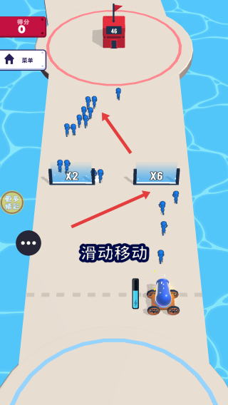 1、滑動屏幕操控藍(lán)色載具移動,在跑道上收集“×2”“×6”等倍數(shù)標(biāo)識,使藍(lán)色士兵數(shù)量按倍數(shù)增加。
