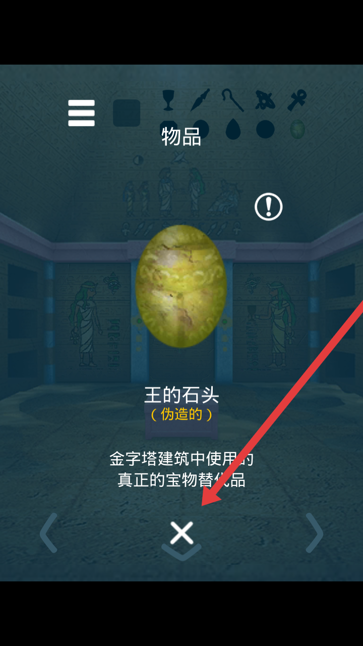 1、查看【王的石頭(偽造的)】物品描述,了解其為金字塔寶物替代品,點擊下方“×”關(guān)閉界面,繼續(xù)探索。