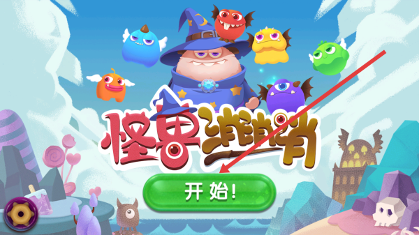 1、在登錄頁(yè)點(diǎn)擊【開(kāi)始!】,進(jìn)入《怪獸消消消》,跟隨劇情指引,了解“消除糖果,完成巫師任務(wù)”的目標(biāo)。