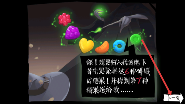 2、劇情頁(yè)點(diǎn)擊右下角【下一頁(yè)】,查看巫師要求(除掉6種糖果,找第7種),推進(jìn)故事,解鎖消除關(guān)卡。