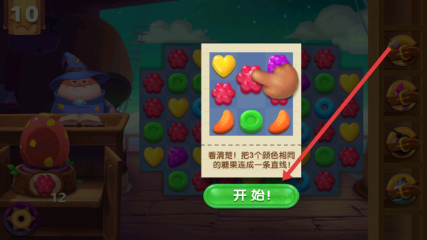 3、關(guān)卡頁(yè)點(diǎn)擊【開(kāi)始!】,需要按規(guī)則(3個(gè)同色糖果連成直線)消除,完成任務(wù),獲取獎(jiǎng)勵(lì),繼續(xù)探索游戲世界。