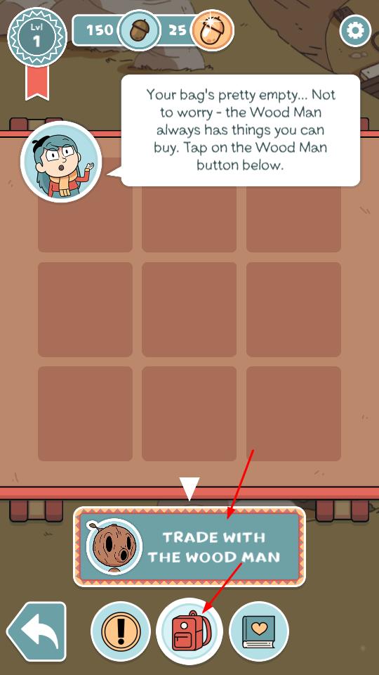 3、打開(kāi)背包界面,點(diǎn)擊“TRADE WITH THE WOOD MAN”,利用橡果交易道具,助力冒險(xiǎn)進(jìn)程。