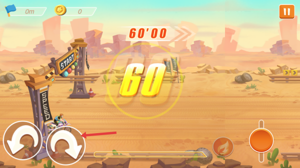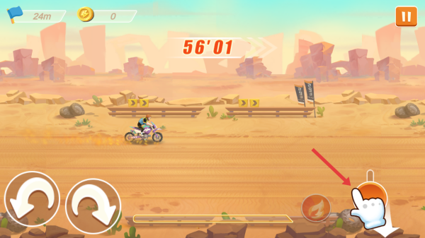 2、在沙漠賽道,用左側(cè)轉(zhuǎn)向按鍵控摩托平衡、方向,右側(cè)按鍵控制加速、特技動(dòng)作。