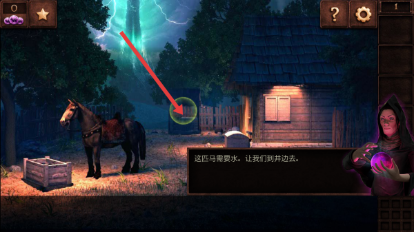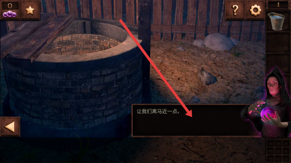 3、獲取水桶和繩子后,按右邊提示回到馬所在的區(qū)域,靠近馬匹,完成喂水等動作,推進解謎的流程。