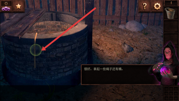 2、進入井邊場景,按指引拿起繩子和桶,完成物品的收集,為打水做好準備,繼續(xù)后面的任務。