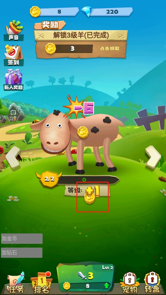 3、完成“解鎖3級羊”任務(wù)后,界面顯示獎勵,點擊領(lǐng)取3金幣,可用來升級工具,提升薅羊毛效率賺更多金幣。
