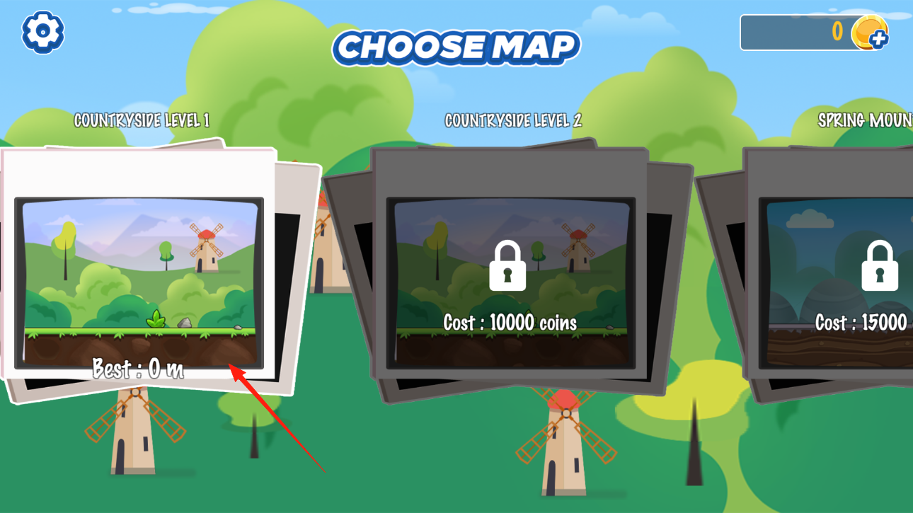 1、進(jìn)入登山賽車之荒野歷險(xiǎn),選【COUNTRYSIDE LEVEL1】這個(gè)解鎖的地圖,進(jìn)入鄉(xiāng)村場(chǎng)景開始游戲,后面的地圖要花錢解鎖,體驗(yàn)在鄉(xiāng)村賽道開車闖關(guān),看看能跑多遠(yuǎn)。