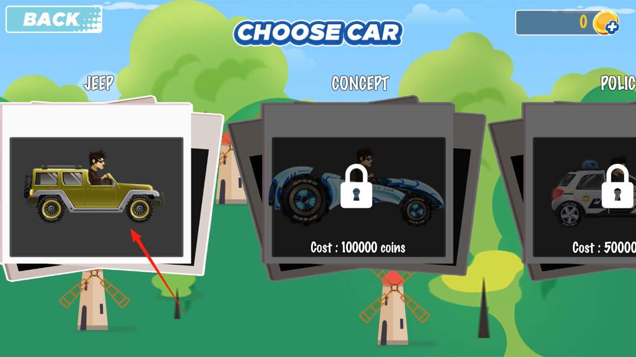 2、進(jìn)入選車界面,目前解鎖的是【JEEP車】,選它進(jìn)入游戲,其他車得攢金幣解鎖,先開著吉普感受下,看怎么操作能讓車跑得更穩(wěn)更遠(yuǎn),體驗(yàn)賽車闖關(guān)的樂(lè)趣。