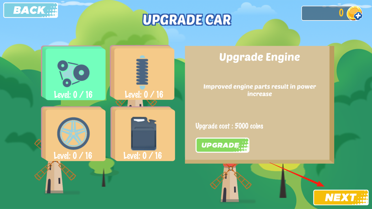 3、到了車輛升級(jí)界面,能給發(fā)動(dòng)機(jī),懸掛等部件升級(jí),比如想提升動(dòng)力,就看看發(fā)動(dòng)機(jī)升級(jí)選項(xiàng),花金幣升級(jí)能讓車更厲害,升級(jí)完點(diǎn)“NEXT”繼續(xù),一步步強(qiáng)化車輛。