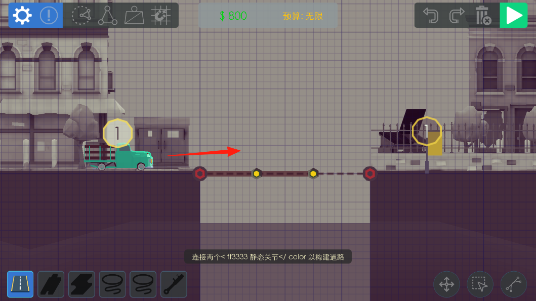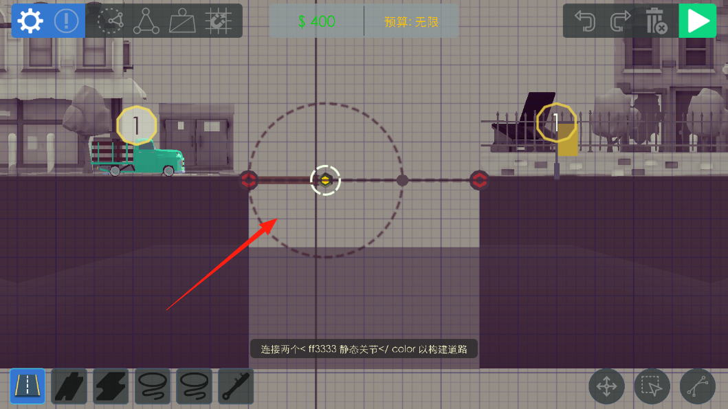 1、在第一幅圖,按提示連接靜態(tài)關(guān)節(jié)(紅圈),用道路工具(底部)搭建跨越溝壑的基礎(chǔ)橋面,消耗金幣($400)。
