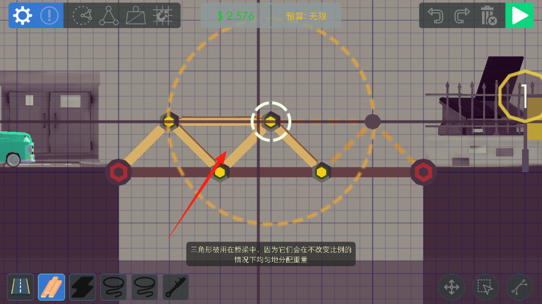 3、第三幅圖,利用三角形結(jié)構(gòu)(提示“均勻分配重量”),用木材工具(底部)搭建三角支撐,強(qiáng)化橋梁,完成后點(diǎn)播放鍵(右上角)測(cè)試車輛通行。