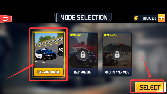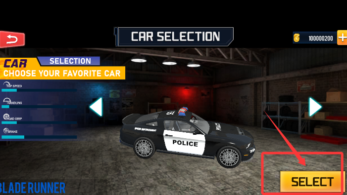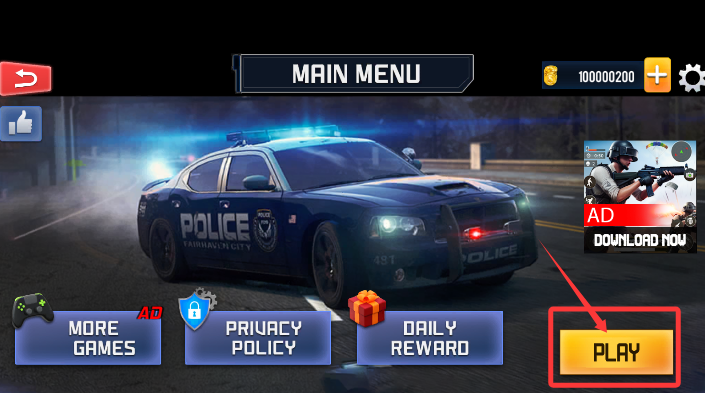 1、啟動(dòng)游戲后,點(diǎn)擊主界面"PLAY"按鈕,進(jìn)入警車挑選界面。