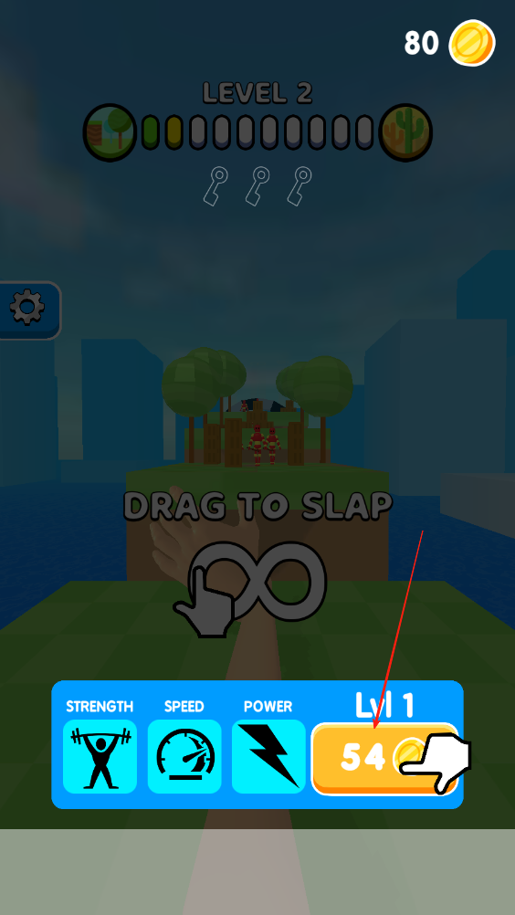 3、賺夠金幣后,在每一關卡開始前,都可以升級手的各方面數(shù)值,例如力氣,速度等,增加攻擊力。