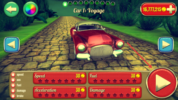 1、初始界面點(diǎn)擊紅色播放按鈕,確認(rèn)紅色復(fù)古賽車屬性速度燃油等均為30,進(jìn)入Car1:Voyage賽道,開啟競速。