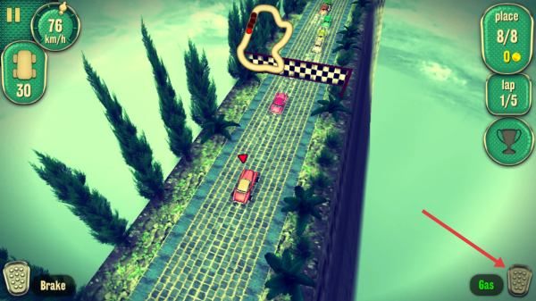 2、比賽中點(diǎn)擊右側(cè)Gas按鈕加速,左側(cè)Brake按鈕減速,依據(jù)賽道彎道對手位置,靈活控車超車。
