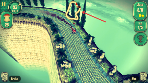 3、關(guān)注上方賽道地圖與名次當(dāng)前8/8,沿石磚路行駛,過彎道時合理剎車加速,爭取提升排名完成5圈賽程。