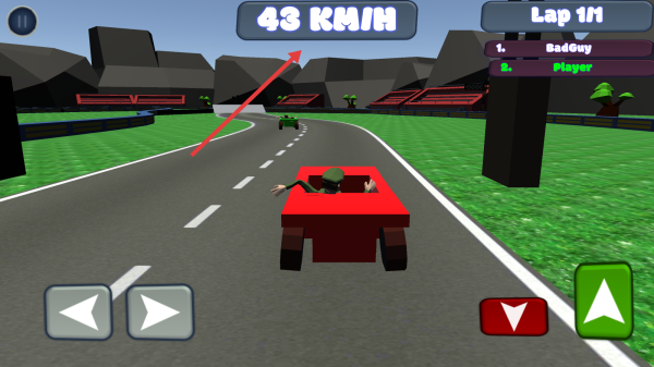 2、選第1關(guān),駕駛紅色賽車,在彎道賽道與Badguy競速,用左右箭頭控方向,關(guān)注時(shí)速。