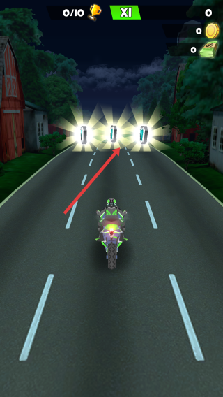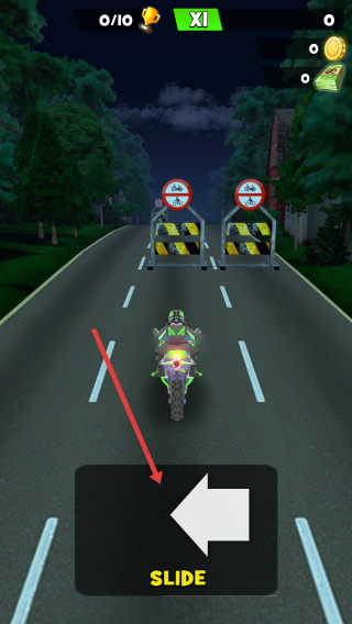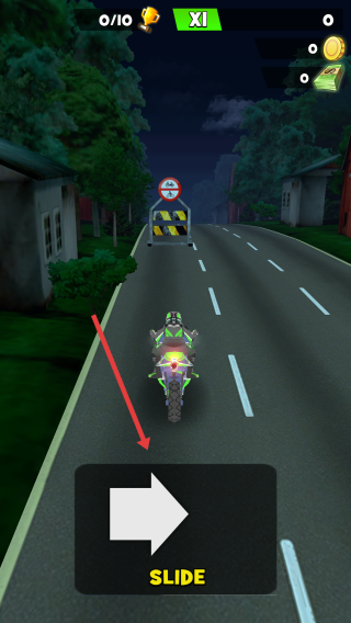 1、點(diǎn)擊SLIDE左右滑動(dòng),操控摩托躲避路障,如雙障礙時(shí)滑向一側(cè)繞開(kāi)。