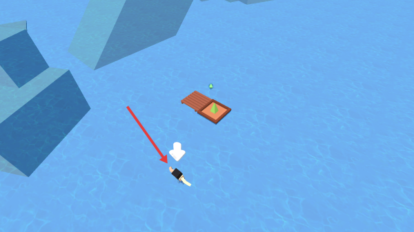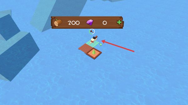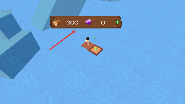 1、操控角色游向木筏,靠近后登上,熟悉初始木筏空間與資源顯示木材、紫色礦石計數。