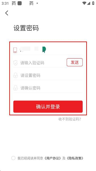 4、輸入手機(jī)號(hào)、獲取并填寫驗(yàn)證碼,設(shè)置密碼后,點(diǎn)擊確認(rèn)并登錄,完成注冊(cè)。