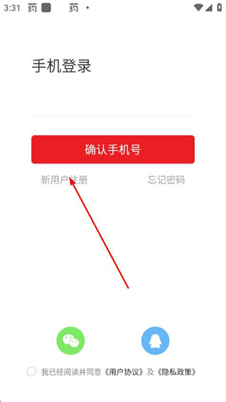 2、進(jìn)入手機(jī)登錄頁后,點(diǎn)擊新用戶注冊(cè)選項(xiàng)。