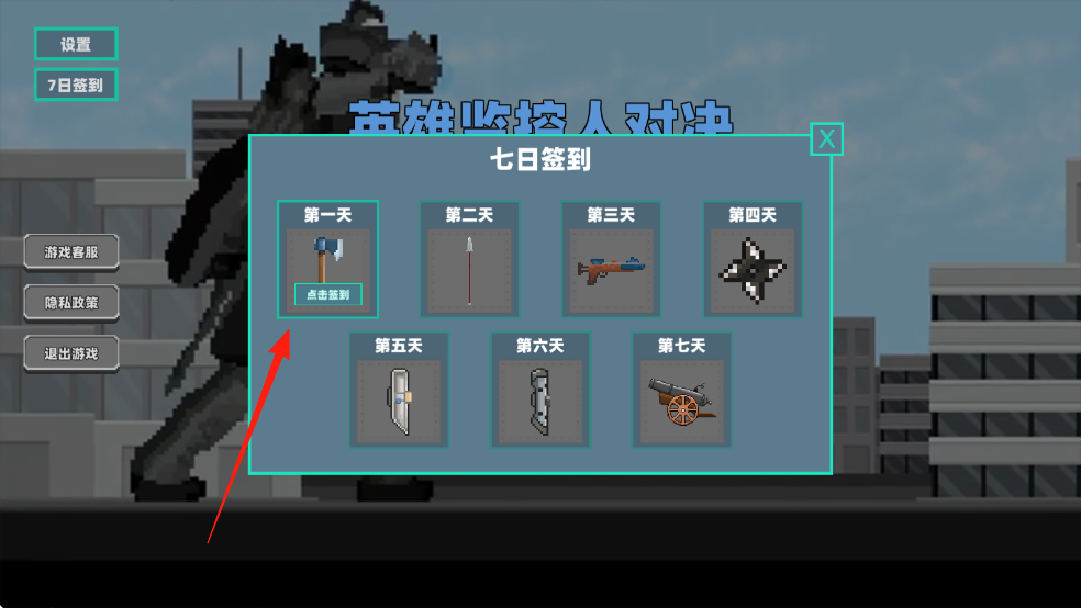 1、進(jìn)入七日簽到界面,點擊第一天點擊簽到箭頭指向,領(lǐng)取初始武器斧頭,為戰(zhàn)斗攢資源。