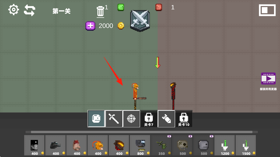 3、關(guān)卡1中,操控箭頭指向的角色,下方選武器如初始斧頭,點擊對應(yīng)圖標(biāo)裝備,準(zhǔn)備戰(zhàn)斗。