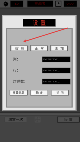 1、進入設(shè)置選難度,可先選容易起步按需填行列數(shù)炸彈數(shù),也可默認點確定開啟掃雷棋盤。