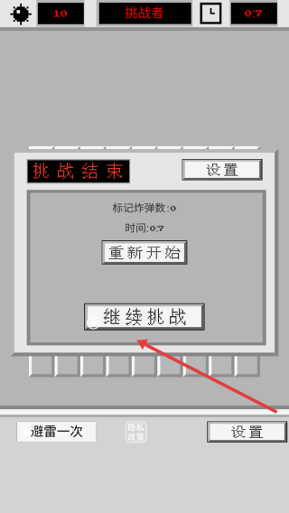 3、挑戰(zhàn)結(jié)束點繼續(xù)挑戰(zhàn)多局積累經(jīng)驗,記數(shù)字周圍炸彈數(shù)規(guī)律逐步提掃雷速度與判斷準確率。