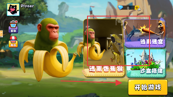 1、游戲開始界面,點(diǎn)擊開始游戲,選擇逃離香蕉猴等玩法進(jìn)入游戲,也可通過商店等功能提前準(zhǔn)備資源。