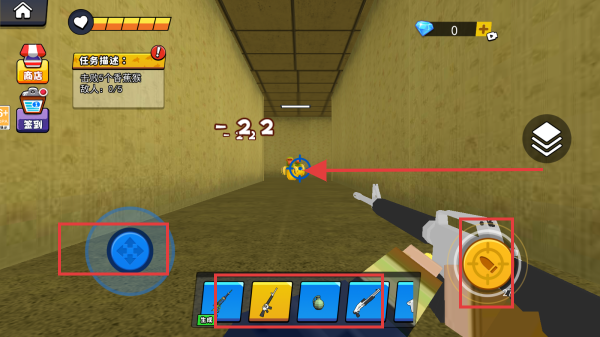 3、游戲?qū)?zhàn)中,根據(jù)任務(wù)描述:擊敗5個(gè)香蕉猴,利用左下角移動(dòng)搖桿走位,右下角按鈕切換武器射擊,消滅敵人完成任務(wù)。