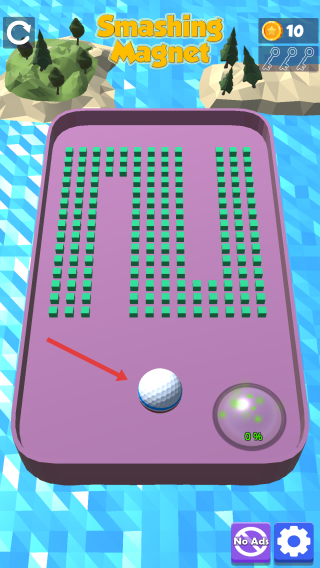 1、點(diǎn)擊白球,借助右側(cè)磁球的磁力吸附白球,引導(dǎo)其撞擊綠色方塊,通過(guò)破壞方塊推進(jìn)關(guān)卡。