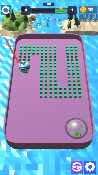 2、白球移動(dòng)過(guò)程中,會(huì)吸附+1類(lèi)道具提升屬性,在磁球能量如100%顯示值耗盡前,盡可能多地破壞方塊,達(dá)成關(guān)卡目標(biāo)。