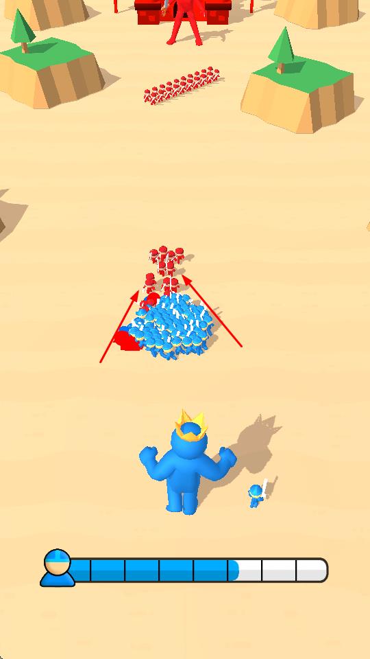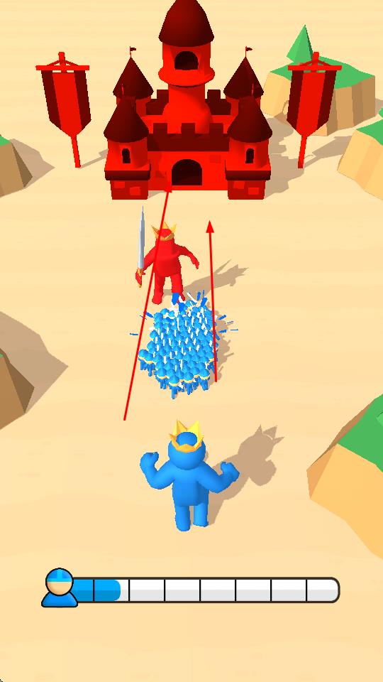 3、隨著游戲推進(jìn),會遇到紅色巨人角色和紅色城堡等目標(biāo),需繼續(xù)壯大己方藍(lán)色小人隊(duì)伍,與紅色巨人戰(zhàn)斗并最終攻擊紅色城堡,完成關(guān)卡任務(wù),獲取游戲勝利。