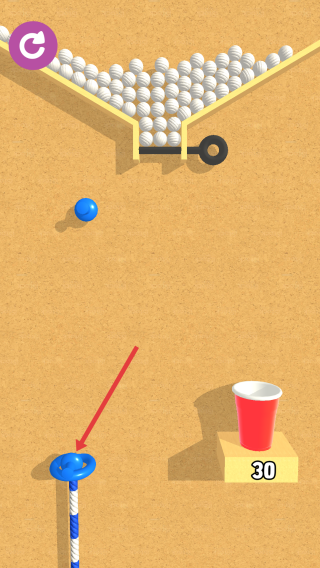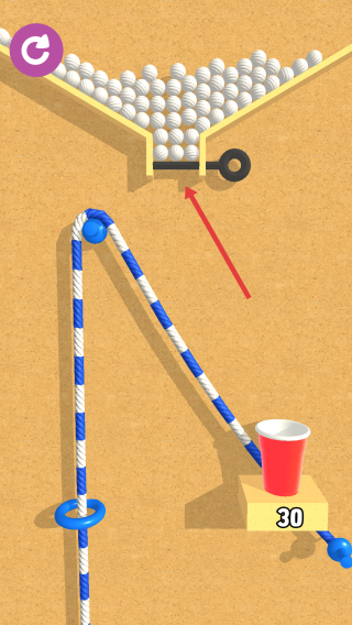 2、點(diǎn)擊上方黑色開關(guān),釋放白色小球,借助繩索引導(dǎo)小球落入紅色杯子。