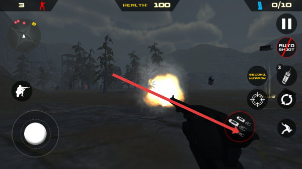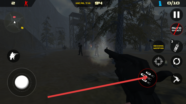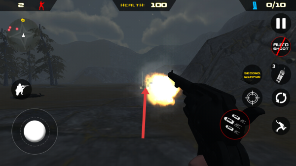 1、進(jìn)入射擊場面,用戶操控虛擬搖桿移動,借樹木、地形作掩護(hù),遇敵點擊射擊按鈕或開自動射擊。