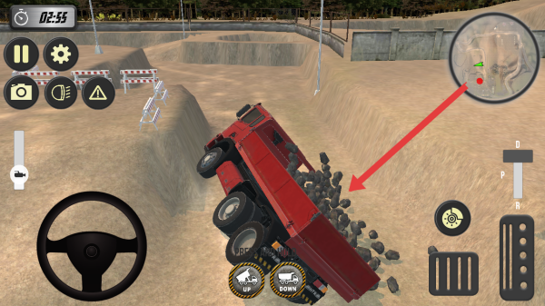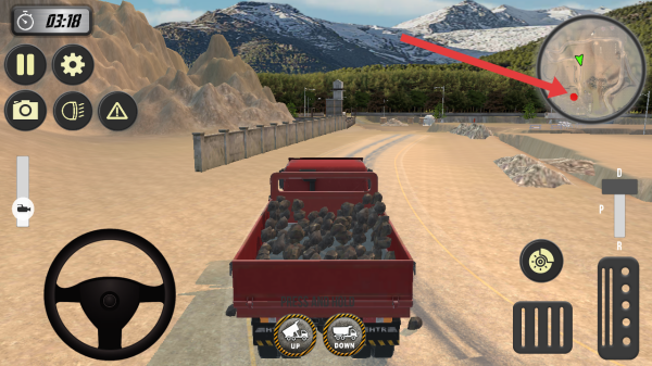 2、在駕駛載有石料的卡車時,參照右上角地圖的紅點目標(biāo),操控方向盤與踏板,朝這目標(biāo)位置行駛。