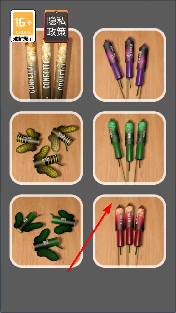 1、進(jìn)入游戲后選擇煙花類型,查看初始煙花樣式與燃放效果,點(diǎn)擊屏幕選擇燃放地點(diǎn),嘗試點(diǎn)燃單支煙花,熟悉基本操作流程。