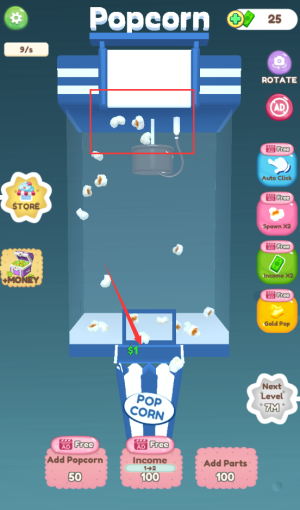 2、觀察紅框容器位置,收集掉落的爆米花積累數(shù)量。