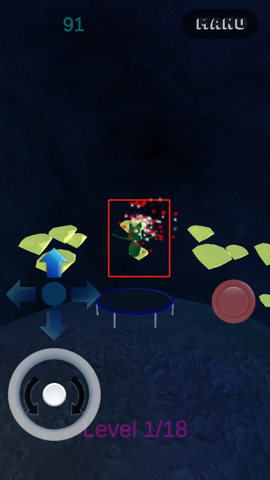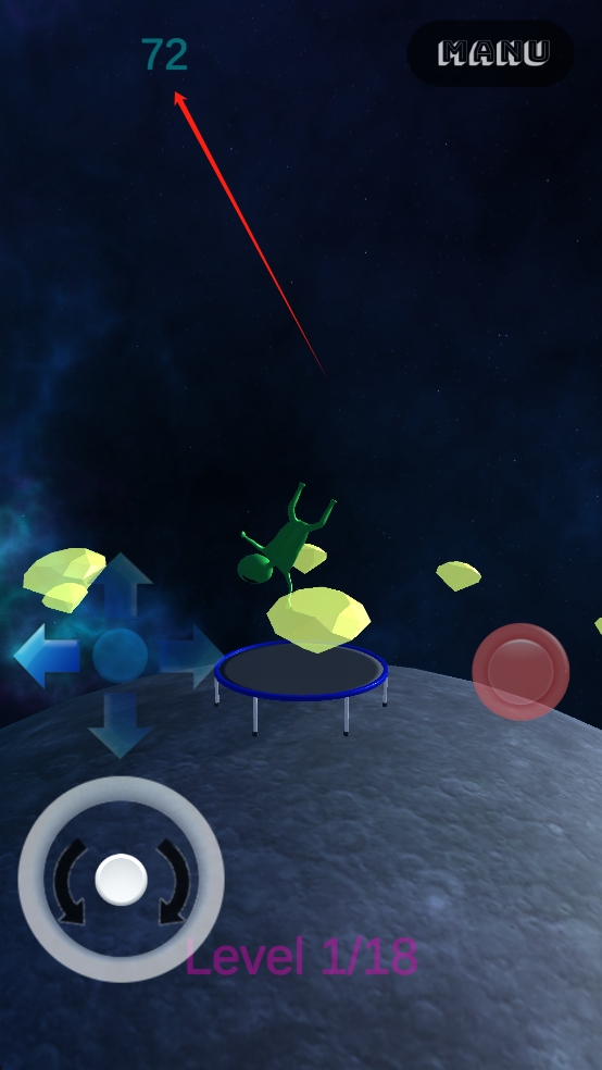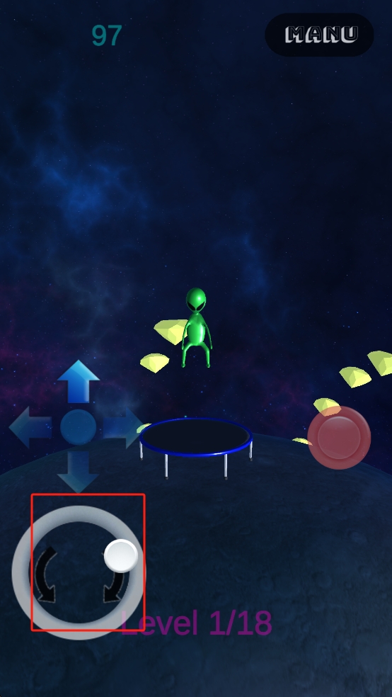 1、操控左下角環(huán)形按鍵旋轉(zhuǎn)外星人朝向,配合中間方向鍵調(diào)整位置,使外星人落至蹦床,同時瞄準周圍黃色晶體,準備收集。