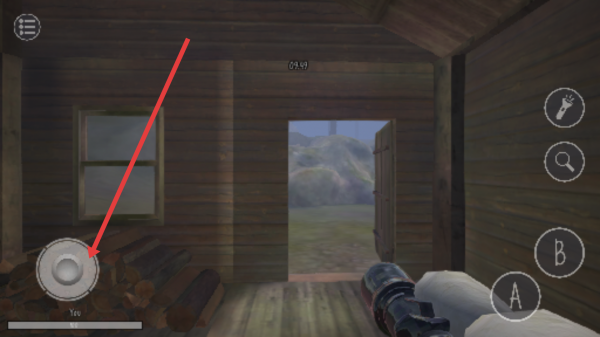 1、游戲初始用戶會處于木屋場景,可利用左側(cè)搖桿移動操作角色前進探索,同時留意右側(cè)手電筒放大鏡等功能按鈕。
