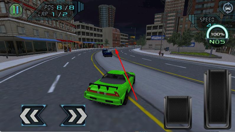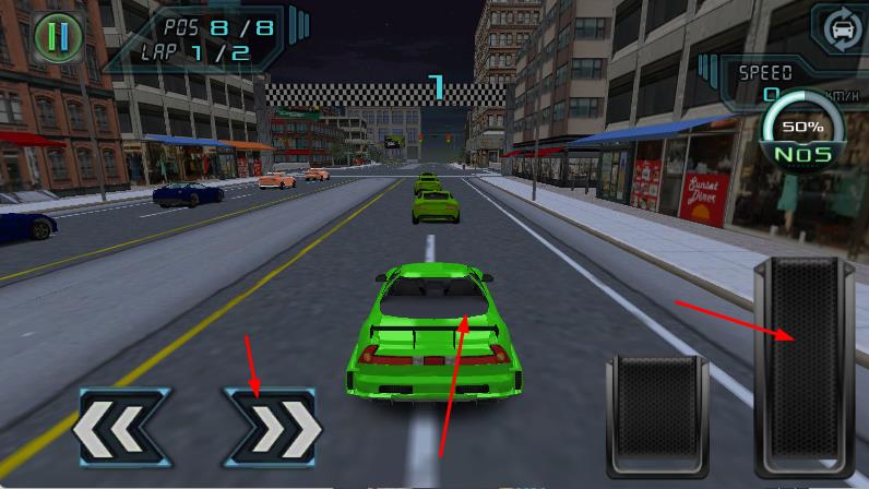 2、比賽中,用左右箭頭按鈕控制方向,右側按鈕可使用氮氣加速,在公路賽道超越其他車輛。