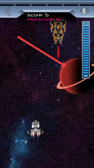 2、在飛行中需要規(guī)避敵方飛船發(fā)射的紅色激光,還需要繞開(kāi)紅色的行星,避免飛船碰撞損耗。