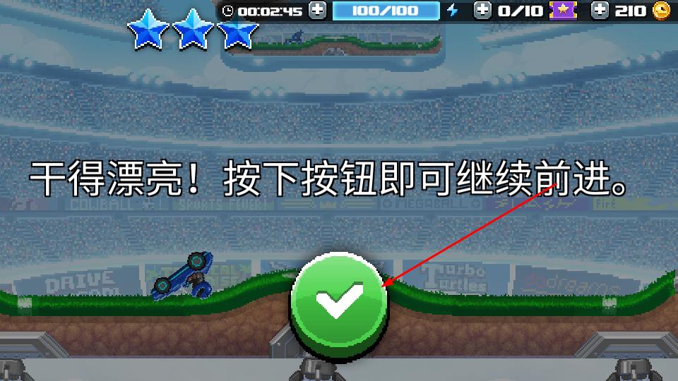 3、成功通過賽道后,點(diǎn)擊綠色對勾按鈕,完成結(jié)算,可繼續(xù)推進(jìn)游戲,就能開啟新競速關(guān)卡挑戰(zhàn)更多復(fù)雜賽道。