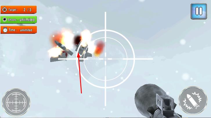 2、當(dāng)瞄準目標后,點擊右側(cè)的射擊按鈕,發(fā)射炮彈攻擊敵機。