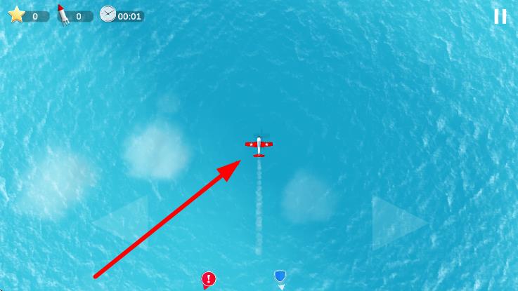 2、操控箭頭指向的飛機(jī),在藍(lán)色海域上空飛行,注意上方的星星道具,為攻擊做準(zhǔn)備。