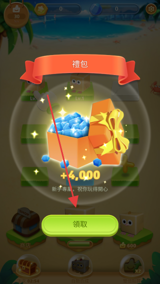 1、進(jìn)入游戲后,在游戲界面找到領(lǐng)取按鈕并點(diǎn)擊,獲取新手禮包,獲得4000個藍(lán)色寶石。