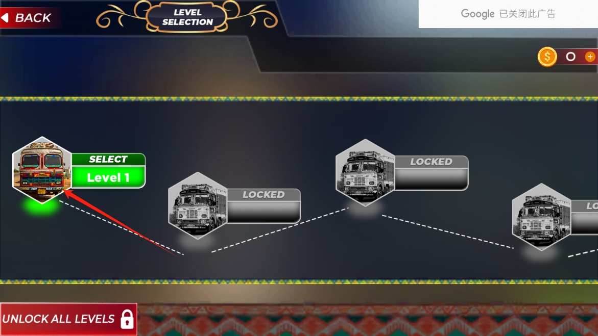 2、進入關卡選擇場景,根據(jù)箭頭提示,選擇第一關,確定駕駛任務,為卡車駕駛挑戰(zhàn)做好準備,點擊選擇關卡。
