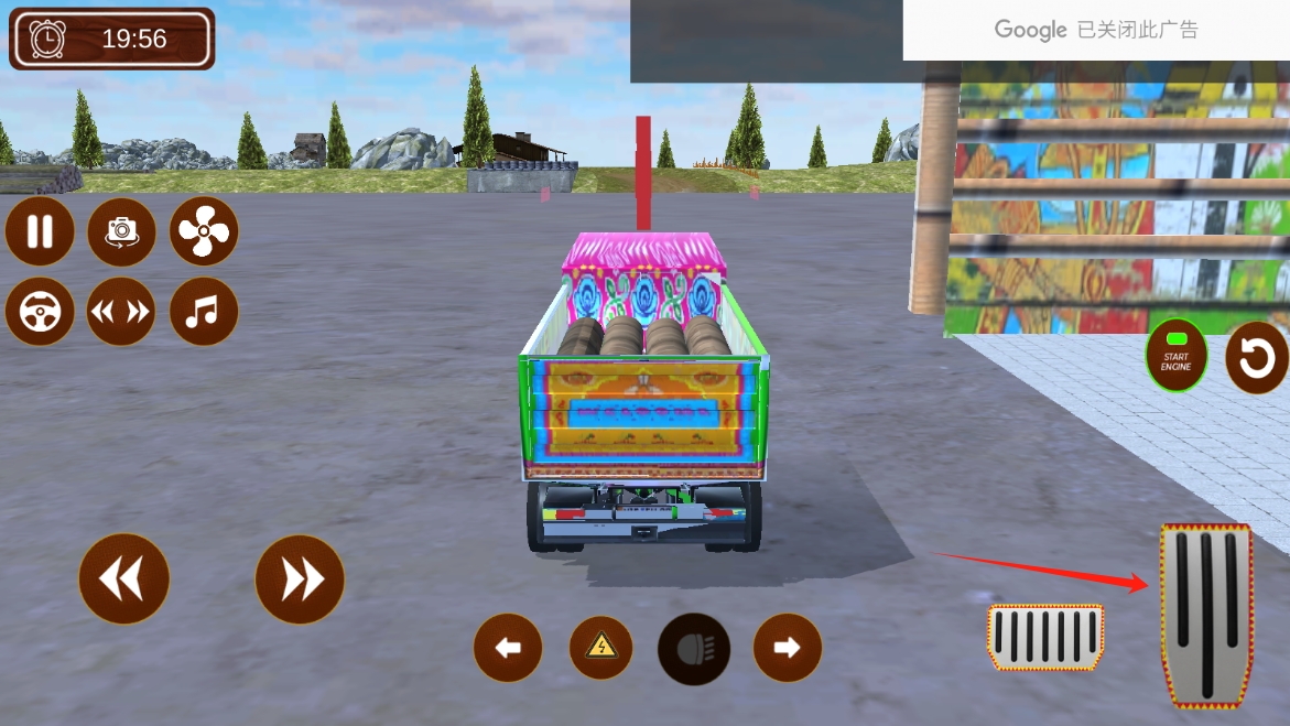 3、在駕駛操作場景中,根據(jù)箭頭提示,操控卡車,躲避障礙,運輸貨物,順利完成卡車駕駛任務,推進游戲進度,點擊加速。